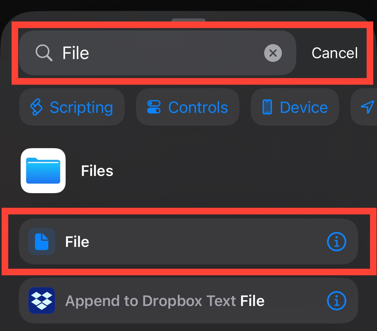 Once you add it, it will appear all the way down in the Shortcut hierarchy. Drag it up directly below the Files action we first placed. It should look something like this: