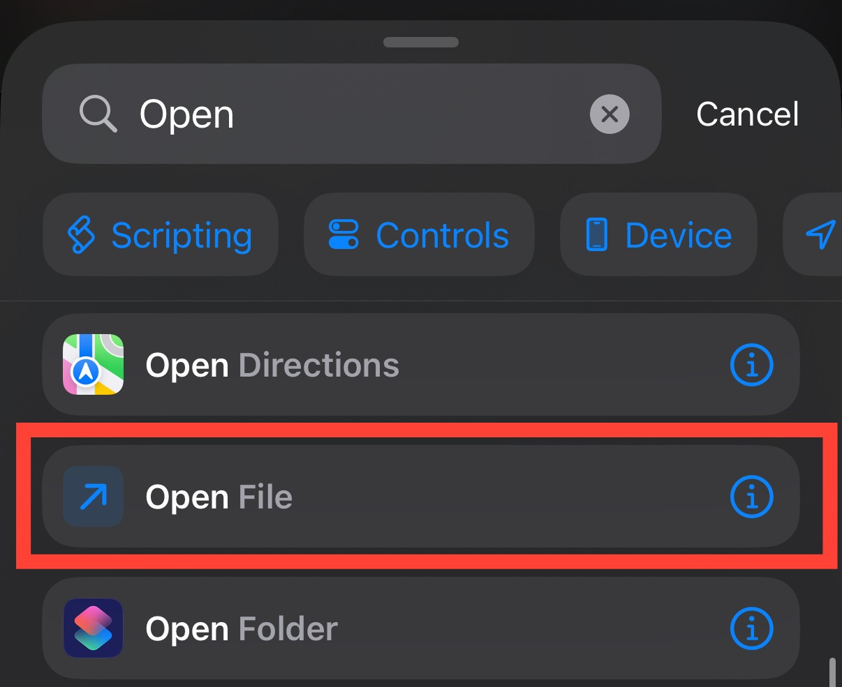 Once you select your folder path, the final step is to add a second action, which is called Open. From the Search towards the bottom, look for โOpenโ and select โOpen Fileโ